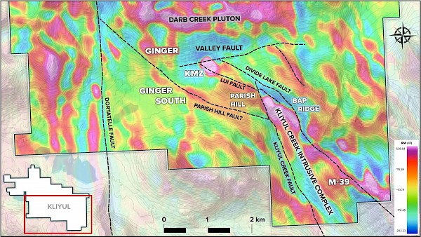 - Indicate a potentially mineralized 700 m NNE-trending corridor, the KMZ-Klip Corridor, from KMZ to the southern margin of a large magnetic and resistivity high anomaly associated with the Darb Creek pluton, a satellite intrusion of the Hogem batholith.