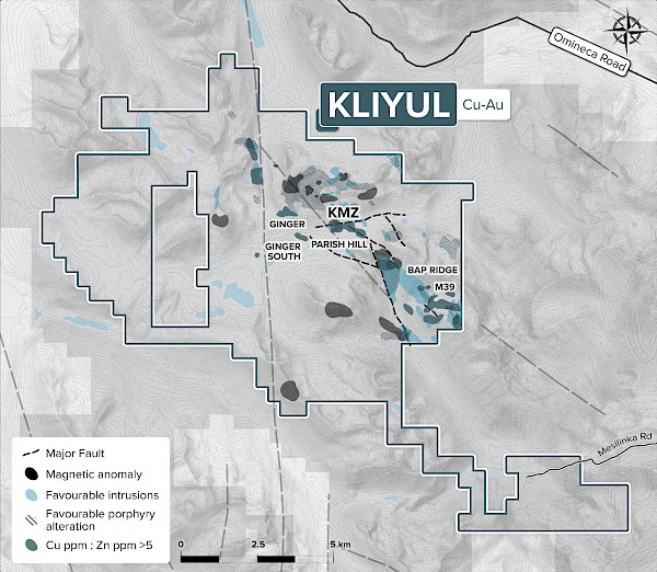 Kliyul hosts six porphyry targets: Kliyul Main Zone ("KMZ"), Bap Ridge, Ginger, Ginger South, M39, and Parish Hill. Each target represents an interpreted porphyry centre over an underexplored 6 km long mineralized trend.