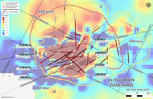 - Drilling confirmed that neighbouring fault blocks (Kliyul West, Kliyul North, East Wedge) to the KMZ block have chlorite-sericite alteration and associated mineralization suggesting these blocks are downthrown several 100 m relative to the central KMZ block, and that these blocks have good preservation potential for different segments of a larger porphyry deposit;