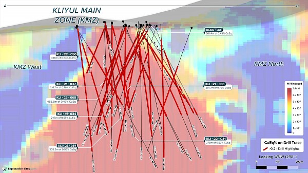 - KLI-23-068, collared in KMZ West, returned 110.0 m of 0.97% CuEq* or 1.44 g/t AuEq** within 455.8 m of 0.43% CuEq* or 0.63 g/t AuEq**.