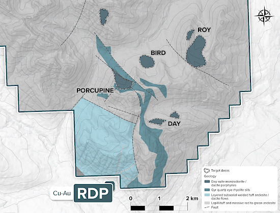 100% owned by the Company, RDP is located in B.C.’s Golden Horseshoe at the southern end of the Toodoggone district, 40km west of Pacific Ridge’s flagship Kliyul. In 2025, the Company completed five drill holes at the Day target (see Figure 3) with drill hole RDP-25-011 returning 112.2m of 1.35% CuEq* (0.76% copper, 0.86 g/t gold, and 3.16 g/t Ag) within 405.0 m of 0.71% CuEq* (0.44% copper, 0.38 g/t Au and 1.87 g/t silver) (see news release dated October 16, 2025). This is the best intercept ever recorded at RDP, surpassing the previous best intercept of 107.2 m of 1.39% CuEq* (0.63% copper, 1.10 g/t gold, and 2.91 g/t silver) within 497.2m of 0.66% CuEq* (0.37%Cu, 0.40 g/t Au, 1.60 g/t Ag), which was returned in drill hole RDP-22-005 (see news release dated October 25, 2022).