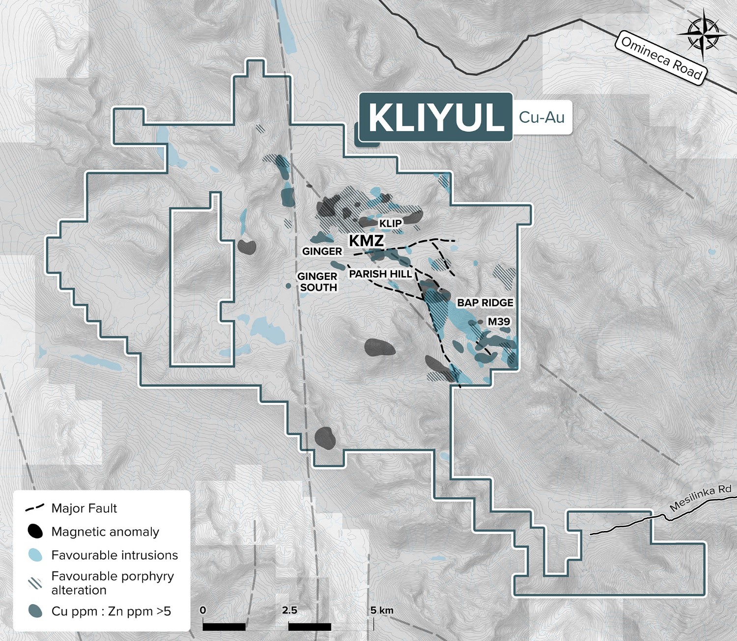100% owned by Pacific Ridge, Kliyul is located in the prolific Quesnel Terrane close to existing infrastructure. The Kliyul Main Zone ("KMZ") hosts 334.1 million tonnes (“Mt”) grading 0.33% copper equivalent (“CuEq”)*, 0.15% copper, 0.26 g/t gold, and 0.95 g/t silver, or 2.42 billion pounds CuEq*, which includes 1.11 billion pounds of copper, 2.74 million ounces of gold and 10.22 million ounces of silver, in the Inferred Mineral Resource category (see news release dated September 18, 2025) and remains open for expansion. KMZ is just one target area along an underexplored 6-km long mineralized trend (see Figure 2).